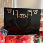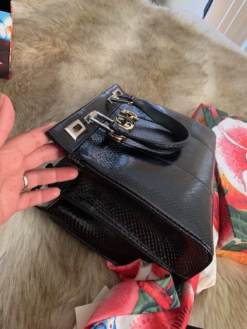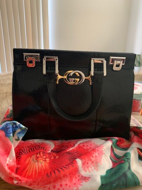 Moving on to the exotic handbag. One of my favorite designers is Gucci especially for exotics. Gucci’s exotic handbags are unique in design and quality. I especially appreciate their designs as I know quality will never fail. Almost all of their exotic handbags are appealing to me and my style. I’ll start with one of my first purchases. The Gucci Zumi black python bag that can be worn in multiple ways. Double leather handles with 4.5” drop. A detachable and adjustable leather shoulder strap with 17.3” drop. Shiny gold and silver toned hardware. Interlocking G Horsebit. A Design that was brought back from Gucci’s archives! Three interior gussets, zipper pockets. A center compartment with a zipper , burgundy leather and viscos interior. Protective metal feet at the bottom. That comes in handy when you go out to a restaurant and there’s no where to place your purse except close to your feet on the floor.